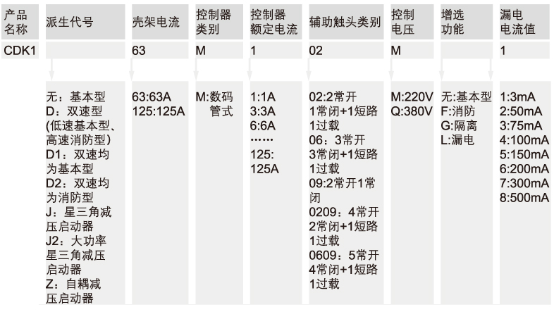 CDK1系列控制与保护开关电器(以下简称CDK1),主要用于交流50Hz、额定工作电压至380V、主体额定电流自1A至125A、智能控制器可调工作电流自0.4A至1 25A、控制电机功率自0.05KW至5 5KW的电力系统中接通、承载和分断正常条件下(包括规定的过载条件) 的电流或电压,也能够接通、承载一定时间和分断规定的非正常条件下(如短路、欠压等)的电流或电压。