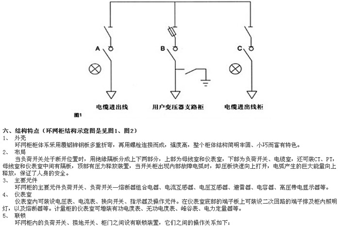 HXGN21-12型金属封闭环网开关设备 (以下简称环网柜)。适用于额定电压12kV,额定频率50Hz的环网供电系统、双电源辐射供电系统、或单电源配电系统,作为变压器、电容器、电缆、架空线等电力设备的控制和保护装置。亦适用于箱式变电站,用作高压配电部分,它是我国城市电网改造和建设所需要的新一代高压电器成套设备。该产品设计及技术性能全面满足IEC298《额定电压1kV以上52kV以下交流金属封闭开关设备》,IEC420《高压交流负荷开关—熔断器组合电器》;GB3906《3~35kV交流金属封闭开关设备》;GB11022《高压开关设备通用技术条件》及DL404《户内交流高压开关柜订货技术条件》等有关标准的要求。