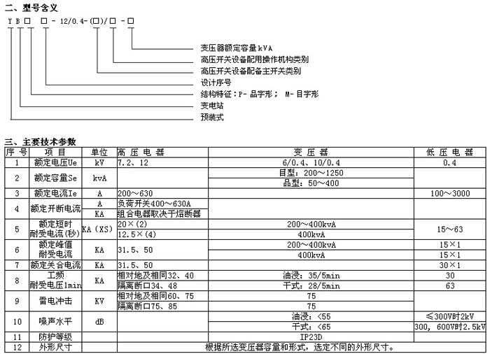 YBM、YBP系列预装式变电站符合SD320-1992《箱式变电站技术条件》和GB/T17467-1998《高压/低压预装式变电站》的标准。