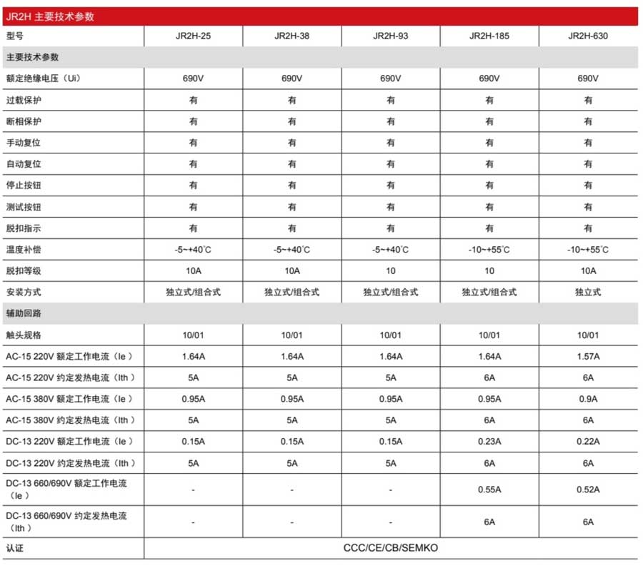 JR2H热过载继电器适用于交流50Hz/60Hz、电压至 690V、整定电流0.1~93A的长期工作或间断工作的交流电动机的过载与断相保护。 热继电器还具有动作指示、自动与手动复位、停止及测试等功能,产品性能稳定可靠。热继电器可与接触器接插安装,也可独立安装。