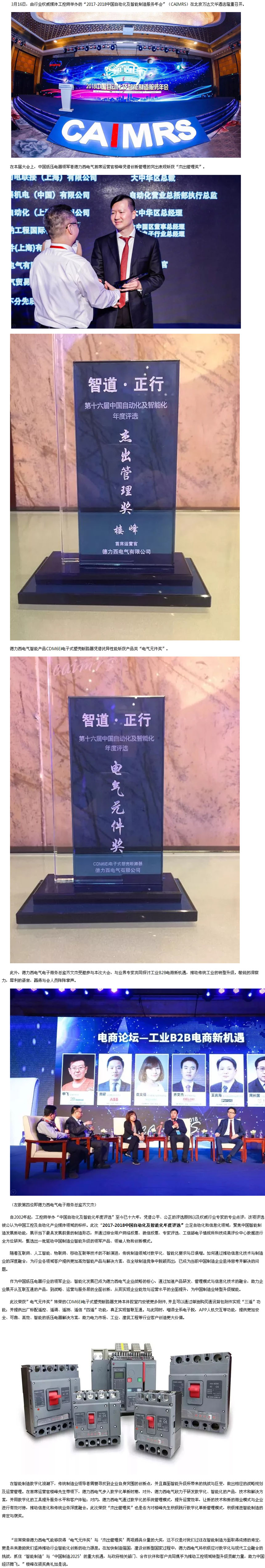 德力西电气斩获“2017-2018中国自动化及智能化年度评选”两项重磅大奖